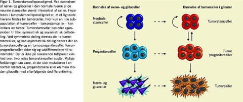 Indtil for nylig har der været enighed om, at gliomer opstod fra astrocytter, oligodendrocytter eller ependymceller, og de er blevet klassificeret efter deres histologiske karakteristika i overensstemmelse med WHOs kliniske retningslinjer. Ny forskning tyder imidlertid på, at gliaceller og neurale stamceller er lige gode kandidater til celletyper, hvor tumorgenesen kan finde sted, hvilket hænger godt sammen med fundet af tumorstamceller. Mutationer i en normal stamcelle, en progenitorcelle eller en mere moden gliacelle med efterfølgende dedifferentiering er mulige forklaringer på, hvordan tumorstamceller opstår (Figur 1).