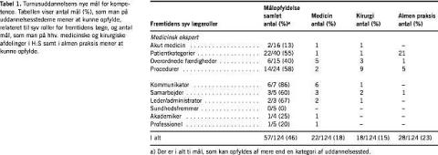 I alt 51 ud af 64 (80%) uddannelsessteder gav oplysninger om, hvilke mål de mente at kunne opfylde. Oplysningerne blev givet fra alle seks kirurgiske afdelinger, alle 14 medicinske afdelinger og 31 ud af 44 alment praktiserende læger. Af de 124 mål kunne 57 (46%) opfyldes med sikkerhed af en eller flere af de tre kategorier af uddannelsessteder: medicin, kirurgi og almen praksis (Tabel 1 ). Med udtrykket »med sikkerhed« menes, at alle uddannelsessteder i mindst en kategori (medicin, kirurgi, almen praksis) kunne opfylde målet. Et mål kunne opfyldes af alle tre kategorier af uddannelsessteder, nemlig »udfærdige henvisninger, epikriser, attester og recepter«, og ni mål kunne opfyldes af to kategorier af uddannelsessteder. Dette sammenfald var især gældende for medicin og kirurgi. Specielt lav grad af forventet målopfyldelse sås inden for akut medicin, hvor kun to af de 16 mål med sikkerhed kunne opfyldes, og inden for rollerne som sundhedsfremmer, akademiker og professionel, som bl.a. omfatter »anvende evidensbaseret medicin i relation til praktisk klinisk arbejde ...«, »identificere og gøre brug af mulighed for egen personlig og faglig kompetenceudvikling«, »kontinuerligt evaluere egne evner, viden og færdigheder og erkende personlige, faglige og etiske grænser«.