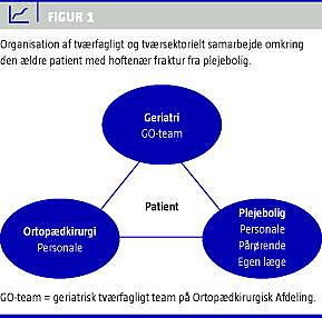 På Århus Sygehus blev der i 2003 oprettet et geriatrisk tværfagligt team på Ortopædkirurgisk Af-deling (GO-team) til at indgå i et samarbejde med det ortopædkirurgiske personale. GO-teamet består af læge, fysioterapeut og sygeplejerske med geriatrisk indsigt og varetager den medicinske behandling og rehabilitering hos alle patienter på 65 år og derover, som er indlagt med akut hoftenær fraktur. Teamet fungerer i alle dagtimer på hverdage, og den geria-triske indsats begynder så tæt på indlæggelsestidspunktet som muligt og med tidlig involvering af hjemmepleje og pårørende. Faldårsag og osteoporose udredes og behandles. Efter udskrivning fra Orto-pædkirurgisk Afdeling følges patienten hjem af teamet med opfølgende besøg eller overflyttes til geriatrisk rehabiliteringsafdeling. Opfølgende besøg indgår i begrebet »hospital i hjemmet« og er en service, der varetager behandling i hjemmet ved tidlig udskrivning med efterfølgende rehabilitering i hjemmet. En tværfaglig geriatrisk indsats i hjemmet er fra litteraturen internationalt anerkendt [10] (Figur 1 ). Resultaterne fra et followup-studie peger i retning af, at GO-teamet på Århus Sygehus var medvirkede til at reducere indlæggelsesvarigheden med to dage (mediant), og der var en tendens mod, at incidensen af nye frakturer over tid kunne reduceres [2].