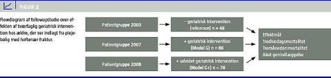 Materiale og metoder: I et followupdesign undersøges 211 ældre fra plejebolig, der havde været indlagt til operation af hoftenær fraktur. Geriatrisk Team på Ortopædkirurgisk Afdeling besøgte den ældre senest dagen efter udskrivning. Antallet af opfølgende besøg afhang af behov for behandling og rehabilitering. Interventionen fokuserede på ernæring, væsketerapi og blodtransfusion.