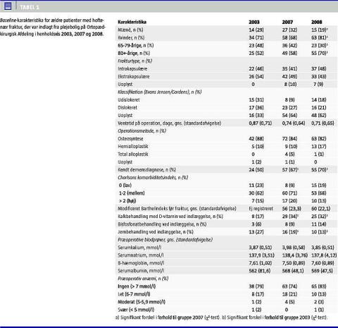 Kvinder udgjorde hovedparten af populationens tre patientgrupper. Aldersgennemsnittet var stigende over årene, og i 2008 var aldersgennemsnittet på 86 år. Populationen var præget af komorbiditet (Charl-sons komorbiditetsindeks). Andelen af demente steg signifikant over årene, og i 2008 havde over to tredjedele en kendt demensdiagnose (Tabel 1 ).