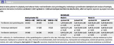Dødeligheden efter akut hoftenær fraktur er høj blandt ældre [6]. Opgørelser fra Det Nationale In-dikatorprojekt (NIP) fra 2005 viser, at på landsplan blev standarden for tredivedages-dødelighed på 10% opfyldt hos patienter med hoftenær fraktur [7]. Imid-lertid sås en regional variation, hvor Århus Sygehus havde en dødelighed på 14%. Sygehuset levede således ikke op til den fastsatte kvalitetsstandard [8]. Et studie fra Århus Sygehus fra samme periode viste, at tredivedages-dødeligheden var signifikant højere hos ældre fra plejebolig end hos ældre fra egen bolig eller ældrebolig. Indlæggelsesvarigheden hos patienter fra plejebolig var tre dage (mediant), og efter udskrivning overgik ansvaret for behandling og rehabilitering til plejepersonalet i plejeboligen og egen læge. Risikoen for død var størst inden for den første uge efter udskrivning til plejebolig [2].