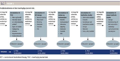 Alle ansatte med K-MVS på Regionshospitalet Silkeborg blev inviteret til at deltage via mail til ledere og via opslag på alle afdelinger tre måneder før start. Tf-JC bestod i sæson 2012-2013 af fem møder a halvanden times varighed afholdt hver anden måned. To uger før hver mødegang modtog deltagerne en artikel, en ordliste og et vurderingsredskab, der matchede den valgte artikels studiedesign (Figur 1). Sundhedssty-