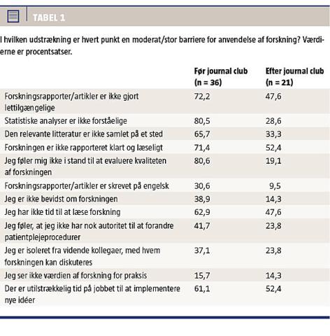 Der var i alt 49 deltagere i Tf-JC. Spørgeskemaet blev besvaret af 36 (73%) før første Tf-JC og 21 (43%) efter sidste Tf-JC. Efter Tf-JC’en havde deltagerne færre barrierer for læsning af forskningsbaseret viden, forståelse samt kritisk læsning af forskningsartikler og statistiske analyser og litteratursøgning. Manglende tid til artikellæsning blev fortsat anset som en moderat til stor barriere for 50% af deltagerne efter Tf-JC (Tabel 1).