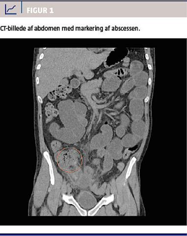 En 34-årig mand, der havde paranoid skizofreni og boede på et socialpsykiatrisk botilbud, blev pga. flere dages mavesmerter indlagt på en somatisk afdeling. Man fandt en øm udfyldning i højre fossa, men ingen peritoneal reaktion. Patienten var septisk. På mistanke om abdominal infektion foretog man en akut CT af abdomen, hvor der blev påvist en periappendikulær absces, der målte 4,6 × 9,3 cm og strakte sig ned bag blæren og ned mod fossa vesico rectalis (Figur 1). Man bemærkede, at abscessen sad svært, men dog tilgængelig for drænage og fandt indikation for at foretage proceduren. Patienten blev gentagne gange informeret om tilstandens potentielle farlighed, og af bl.a. tilkaldt personale fra botilbuddet, forsøgte man at motivere ham til at lade sig behandle som anbefalet. Han accepterede fortsat frivillig indlæggelse, men frabad sig nogen form for kirurgisk behandling. Han gav dog samtykke til behandling med relevant intravenøst givet antibiotika.