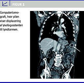 En 80-årig mand blev diagnosticeret med inoperabelt adenokarcinom i den distale del af øsofagus. Canceren var stenoserende, og patienten havde udtalte synkeproblemer, hvorfor der med god effekt blev anlagt en coated, selvudfoldende øsofagusstent. Efterfølgende gennemgik patienten behandlingen med en kombination af kemo- og radioterapi med radiologisk god respons på øsofaguscanceren. Tre måneder senere opstod ileuslignende symptomer i form af kolikagtige smerter ved fødeindtagelse, kvalme og opkastninger. Der blev foretaget computertomografi (CT) af thorax og abdomen, som viste, at stenten var displaceret til tyndtarmen ca. 50 cm fra Treitz' ligament og med ødem og inflammation omkring stenten (Figur 1 ). Tyndtarmen var lettere dilateret oralt for stenten, men på CT`en var der ingen tegn til perforation eller fri intraperitoneal væske. Efterfølgende tyndtarmspassage bekræftede CT-fundet. Der blev foretaget laparotomi, og her fandt man, at stenten delvist var migreret ud af tyndtarmslumen ca. 50 cm fra Treitz' ligament med truende perforation. Der var lokal abcesdannelse, men der fandtes ingen generaliseret peritonitis. Der blev foretaget resektion af 20 cm tyndtarm, inklusive stenten, og der blev udført en primær tyndtarmsanastomose. Patienten blev udskrevet i velbefindende ni dage efter operationen.