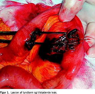 En 47-årig mand fik foretaget mikrokirurgisk partiel hemilaminektomi for en diskusprolaps mellem L5 og S1 på venstre side. Der blev ikke observeret peroperative komplikationer. I timerne efter operationen blev patienten akut påvirket med abdominale smerter og hypotension. Der blev foretaget en computertomografi af abdomen, der viste fri luft og væske intraabdominalt. Ved laparotomi fandtes en liter blod og koagler intraperitonealt samt to fuldvægslæsioner af tyndtarmen med blødning fra det tilstødende tyndtarmskrøs (Figur 1). I retroperitoneum var der en perforation i umiddelbar nærhed af arteria og vena iliaca samt ureter på højre side. Det læderede tarmsegment blev reseceret og primært anastomoseret. Det postoperative forløb var ukompliceret, og patienten kunne efter fire dages indlæggelse udskrives i velbefindende.