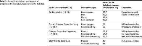 I fire studier fra Kina, Finland, USA og Canada [17-20] har man undersøgt, om livsstilsmodifikation eller medicinsk behandling rettet mod patienter med nedsat glukosetolerance kan forebygge progression til udvikling af manifest diabetes (Tabel 1 ). Resultatet af alle de fire studier er samstemmende, at ændring af kost kombineret med øget fysisk aktivitet kan nedsætte risikoen for udvikling af diabetes over en 6-årig periode med mere end 50%. I de to studier, hvor der også var en medicinsk behandlingsarm, var der også en effekt af medicinsk behandling med perorale antidiabetika, men denne effekt var markant mindre end effekten af livsstilsændring.