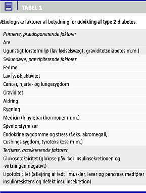 De ætiologiske faktorer kan opdeles i de primære, prædisponerende, hhv. genetisk og føtalt disponerende, i de sekundære, præcipiterende, herunder fedme og fysisk inaktivitet, samt i de tertiære, accelererende faktorer, såsom glukose- og lipotoksicitet (Tabel 1 ). Opdelingen udtrykker det forhold, at man er født med en given risiko for sygdommen, men at man kun udvikler den, hvis man udsættes for en eller flere såkaldt modificerbare faktorer. Når sygdommen først er opstået, er der ofte tale om et point of no return, idet både et forhøjet glukose- og fedtniveau (hhv. »glukosetoksicitet« og »lipotoksicitet«) kan medføre forværringer af metaboliske defekter i både muskler, lever og betaceller.