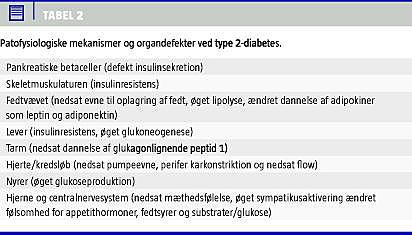 T2D er samtidig en multiorgansygdom (Tabel 2 ), hvor der er holdepunkter for, at der ud over defekter i pancreas, muskler og lever er defekter i fedtvævet (se nedenfor), tarmen (defekt sekretion af inkretinhormonet glukagonlignende peptid 1) [8], centralnervesystemet (appetitregulering) [9] og nyrerne (regulering af glukoseekskretionen i urinen) [10] samt også i reguleringen af kredsløbet. Hvad angår betydningen af hjertekredsløbet, har tonus i modstandskarrene betydning for reguleringen af flow til musklerne og dermed for insulinvirkningen. Nedsat funktion af venstre ventrikel i hjertet medfører ligeledes nedsat gennemblødning i musklerne, og insulinresistensen ved hjerteinsufficiens forværres af sympatikusaktiveringen og muligvis af den samtidige subkliniske inflammation. Betydningen af nedsat venstre ventrikel-funktion som risikofaktor for T2D understøttes af, at der er en sammenhæng mellem dosis og forbrug af loopdiuretika og senere udvikling af T2D [11].