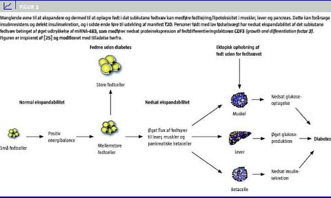 miRNA udgøres af en enkeltstrenget RNA-sekvens, som indeholder ca. 20 baser, som ved binding til DNA og RNA kan påvirke både translation til proteiner og transkription af gener, der indeholder matchende RNA-sekvenser. Specielt proteintranslationer har i den sammenhæng interesse, ikke mindst fordi der er fundet relativt større nedsættelser af ekspressionsniveauer af proteiner i forhold til gener med funktionel betydning for insulinsignaltransduktionen i fedtprøver udtaget fra unge mænd med LFV [18]. I et nyligt publiceret studie fandt vi, at både personer født med LFV og afkom af rotter, som i graviditeten var udsat for proteinunderernæring, udviste en øget ekspression af miRNA-483-sekvensen, og en efterfølgende bioinformatisk analyse viste, at fedtdifferentieringsfaktoren growth and differentiation factor (GDF)-3 var blandt de kendte »mål« for miRNA-483 [24]. I de samme fedtprøver fandt vi, at proteinekspressionen af GDF3 var nedsat både hos mænd med LFV og hos de rotter, som var udsat for proteinunderernæring i graviditeten [24]. Det interessante i undersøgelsen er dermed, at vi har påvist en ny molekylær mekanisme, som kan forklare, hvordan nedsat vækst i fostertilværelsen kan give anledning til manglende udvikling og/eller modning af det subkutane fedtvæv, hvilket - jf. ovenstående hypotese - kan forklare, hvordan lipotoksicitet kan bevirke insulinresistens og nedsat insulinsekretion og dermed risiko for T2D hos personer med et relativt lavt BMI (Figur 1 ).