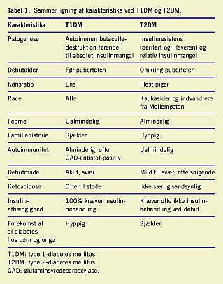 Diabetes i barnealderen inddeles i autoimmun T1DM, T2DM og andre specifikke typer af diabetes, hvorunder MODY og sekundær diabetes hører [1, 15, 17]. T1DM er i de vestlige lande langt den hyppigst forekommende. De kliniske forskelle mellem hovedgrupperne T1DM og T2DM fremgår af Tabel 1 .