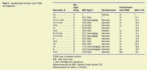 En spørgeskemaundersøgelse blev foretaget på alle landets 19 børneafdelinger samt Steno Diabetes Center, som efter reglerne varetager al diabetesbehandling for børn og unge < 16 år i Danmark. Undersøgelsen blev gennemført i maj-juli 2002 med en opgørelsesdato pr. 15. juli 2002. Debuttidspunktet for T2DM var omkring puberteten, der var lidt flere piger end drenge, flertallet var svært overvægtige i forhold til alderen, to var af pakistansk oprindelse, en havde hypertension med et blodtryk på 146/90 ved debut og flertallet havde en familiær disposition for samme sygdom (Tabel 2 ).