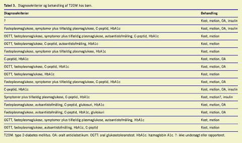 Type 2-diabetes mellitus (T2DM) har typisk været opfattet som en lidelse hos voksne, mens type 1-diabetes mellitus (T1DM), den autoimmune diabetes, var barnealderens og ungdommens sygdom. Der er påvist en stor stigning i hyppigheden af T2DM hos voksne [1-4], mens oplysninger om stigningen i barnealderen og adolescensperioden mangler. Forekomsten af T2DM hos børn og unge er nu beskrevet i USA og i Europa, og i visse områder har man set en stigende hyppighed specielt knyttet til etniske minoriteter [1-14].