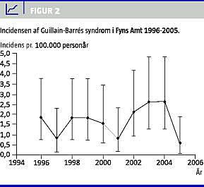 KONKLUSION: Der blev ikke fundet signifikant stigning af GBS i undersøgelsesperioden. Tilfældene af GBS var spredt over tid uden ophobning af angivet forudgående hændelse. Incidensen af GBS for hele perioden på 1,65 pr. 100.000 personår er sammenfaldende med tidligere undersøgelser på området.
