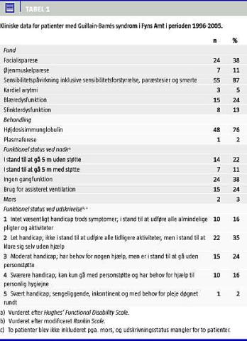 Tabel 1 viser kliniske data for den samlede studieperiode. Funktionel status ved nadir for de 62 patienter med typisk GBS vurderet efter Hughes' Functional Disability Scale ses i Tabel 1. Varigheden af respiratorbehandling hos patienter med behov for assisteret ventilation varierede mellem tre og 36 dage med et gennemsnit på 15 dage. Fire patienter er ikke inkluderet i denne beregning. To af disse patienter havde brug for langvarig respiratorbehandling og overgik til respirationscenter udenamts, og to døde under respiratorbehandling. Funktionel status ved udskrivelse fra hospitalsbehandling eller rehabilitering for de 62 patienter med typisk GBS ses i Tabel 1. To patienter er ikke inkluderet pga. mors, og udskrivningsstatus manglede for to patienter.