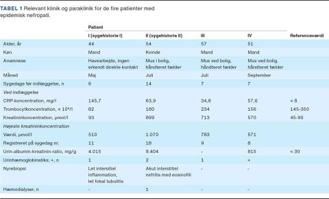 II. En 54-årig kvinde blev indlagt efter to uger med utilpashed, kvalme, hovedpine og træthed. Ved indlæggelsen havde hun akut nyresvigt med et kreatininniveau på 899 µmol/l. Der blev fundet trombocytopeni, albuminuri på 458 mg/døgn og mikroskopisk hæmaturi. En nyrebiopsi viste akut interstitiel nefritis. Pga. svær uræmi blev der udført en enkelt hæmodialyse. Herpå bedredes nyrefunktionen, og der indtrådte polyuri. Efter fire uger var nyrefunktionen normaliseret. Patienten var inden indlæggelsen fraflyttet en bolig, der var plaget af mus.