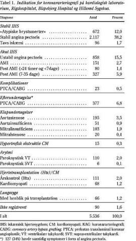 I alt 5.536 konsekutive KAG er registreret. Komplet dataregistrering forelå hos over 75%. Detaljer om koronaranatomi forelå hos 96,6%, komplikationsdata hos 96,8%, indikationsdata hos 98,5% og konsekvenser af KAG hos 96,4%. Af de undersøgte var 69% mænd, 31% kvinder. Medianalderen var 61 år (spændvidde: 16-94 år). Indikationerne for KAG fremgår af Tabel 1.