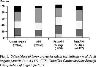 Hyppigheden af signifikant stenose på venstre koronararteries hovedstamme enten med eller uden affektion af andre grene var 2% i CCS klasse 1, 6% i klasse 2, 9% i klasse 3 og 3% i klasse 4 hos patienter med stabil angina pectoris. Hyppigheden af stenose på venstre koronararteries hovedstamme eller stenose på alle tre hovedgrene var tilsvarende 25%, 33%, 44% og 42% (Fig. 1 ).