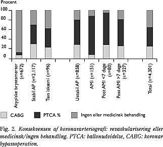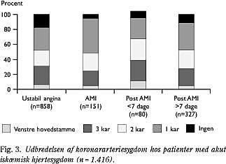 Fig. 3 viser udbredelsen af koronarsygdom hos patienter med akut iskæmisk hjertesygdom, mens konsekvensen i form af PTCA eller CABG fremgår af Fig. 2.