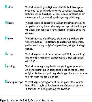 Undervisningen indledtes med to temadage, hvor så godt som alle medarbejdere i afdelingen deltog. Temaet var »bedre patientforløb gennem bedre kommunikation«. Formålet med temadagene var at belyse vigtigheden af god kommunikation for patientforløbene. Den ene af forfatterne (PSH) har udviklet en struktur i patientkommunikationen: Behov og løsning, hvor behovene udtrykkes som patientens problemer, forventninger og ønsker, og løsning udtrykkes som den indsats/plan, der vælges i samråd med patienten (Figur 1 ).