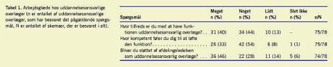 De uddannelsesansvarlige overlæger blev forespurgt, om de syntes, de havde tilstrækkelig pædagogisk viden til at løse opgaven, hvilket 49 (63%) angav, at de havde. Der blev ikke fundet korrelation mellem følelsen af kompetence og deltagelse i antallet af pædagogiske kurser (Pearsons korrelationsanalyse p = 0,922). Der var en signifikant korrelation mellem det at være tilfreds og støtte fra afdelingsledelsen (r = 0,42, p < 0,01). Der var også en klar sammenhæng mellem, hvor kompetent, man følte sig, og støtte fra afdelingsledelsen (r = 0,52, p < 0,01). Var man tilfreds, følte man sig kompetent (Pearson p < 0,01).