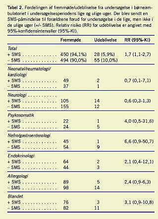 Resultat: I periodens ulige og lige uger udeblev henholdsvis 55 (10,0%) og 28 (5,9%) patienter fra den planlagte undersøgelse i børneambulatoriet. Den relative risiko for at udeblive uden at have fået tilsendt en SMS-påmindelse var 1,7 (95%-konfidensinterval: 1,1-2,7). I alt 68 forældre, svarende til 41,7% af de, som besvarede spørgeskemaet, angav at SMS-påmindelsen var medvirkede til, at de huskede aftalen. Af de adspurgte ønskede 95,1% at modtage en SMS-påmindelse forud for eventuel ny aftale i børneambulatoriet. Blot syv forældre følte sig stødte over den fremsendte SMS-påmindelse.