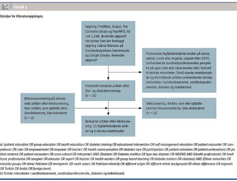 Den identificerede litteratur inkluderer udelukkende kvalitative studier fra henholdsvis Danmark (5), Norge (1), Sverige (1), Storbritannien (5), Schweiz (1), Canada (1) og Australien (1). Heraf er 11 artikler fagfællebedømte, mens fire er danske enkeltstudier. De etniske minoriteter omfatter arabisk- og tyrkisktalende patienter (3), patienter med sydasiatisk (2) og pakistansk baggrund (1) samt en blandet gruppe immigranter fra mange lande (5), og i nogle studier definerer man ikke etniske minoritetsgrupper nærmere (4). Detaljer for litteratursøgningen ses i Figur 1, og oversigt over den inkluderede litteratur ses i Tabel 1.
