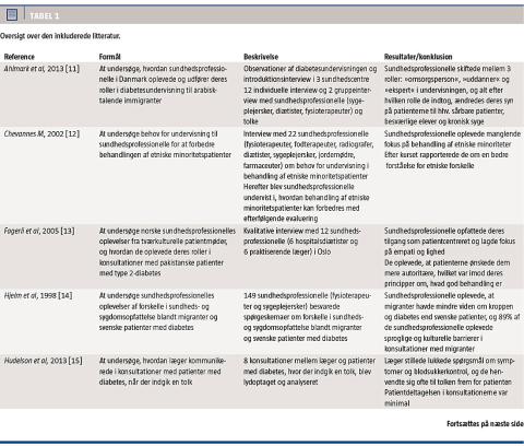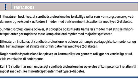 Denne litteraturgennemgang viser, at sundhedsprofessionelle oplever møder med etniske minoritetspatienter som værende mere komplekse end møder med majoritetspatienter. Sundhedsprofessionelle oplever, at etniske minoritetspatienter adskiller sig fra majoritetspatienter i forhold til viden om diabetes, kroppen og kost, hvilket, de mener, vanskeliggør kommunikationen og gør møderne mere tidskrævende. Brug af tolk er ikke uproblematisk, da sundhedsprofessionelle oplever, at deres roller som »omsorgsperson« og »ekspert« udviskes, når der indgår tolke. Sundhedsprofessionelle pointerer vigtigheden af at skabe relationer og at agere patientcentreret i møder med etniske minoritetspatienter, men de oplever, at de mangler kompetencer til at kommunikere med patienterne, og at patienterne foretrækker en mere paternalistisk tilgang. Resultaterne af danske enkeltstudier tyder endvidere på, at sundhedsprofessionelle i Danmark oplever både tidsmæssige, sproglige og pædagogiske udfordringer i behandlingen af etniske minoritetspatienter med type 2-diabetes.