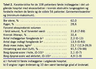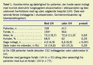I løbet af det første år med UH var der på Hvidovre Hospital i alt 875 indlæggelser på grund af KOL-eksacerbation med en gennemsnitlig indlæggelsesvarighed på 6,3 dage. Heraf kunne 159 (18,2%) indlæggelser fordelt på 108 patienter afkortes ved udskrivelse til UH. Af de 108 patienter havde 20 to forløb, syv havde tre forløb, og fire havde 4-8 forløb. Patienter med og uden udskrivelse til UH er sammenlignet i Tabel 1 .