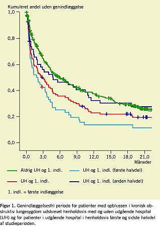 Den lavere andel af vore patienter, der kom i UH, kunne indikere, at de mindre syge patienter blev udskrevet hurtigt uden UH, mens disse i større omfang indgik i de udenlandske studier. Dette støttes for det første af, at andelen af endagsindlæggelser uden opfølgning i UH forblev knap 30% efter indførelse af ordningen, og for det andet af en gennemgang af 100 konsekutive indlæggelser med KOL-eksacerbation på Hvidovre Hospital i 2002, hvor man fandt en tilsvarende tremånedersmortalitet (19%) og genindlæggelsesrate (45,6%) [12]. Hvis vi havde taget patienter med særlig gunstig prognose i UH, ville vi have forventet en dårligere p rognose hos patienterne uden UH.