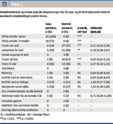 Tabel 1 viser arbejdsrelaterede og private psykologiske eksponeringer hos case- og kontrolpersonerne. Casepersonerne havde i signifikant mindre omfang været udsat for vold og trusler på livet end kontrolpersonerne (p < 0,001). Der var imidlertid ikke andre forskelle på de arbejdsrelaterede og private eksponeringer.
