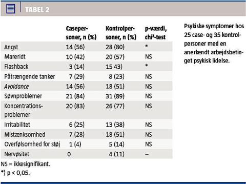 Tabel 2 viser de psykologiske symptomer blandt de 25 case- og de 35 kontrolpersoner. Der var kun få statistisk signifikante forskelle. Kontrolpersonerne havde mere angst (p < 0,05) og flere flashbacksymptomer end casepersonerne (p < 0,02).