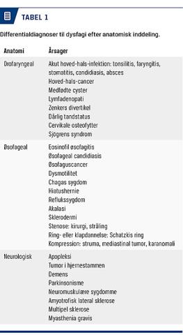 I afklaringen af dysfagi er den anatomiske lokalisation central for bestemmelse af årsagen til symptomet [11]. En anatomisk inddeling i orofaryngeal eller øsofageal dysfagi kan være et værktøj i udredningen (Tabel 1) [12].
