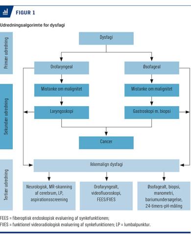 Dysfagi er en kendt udfordring i klinikken og er prævalent hos patienter i alle aldre [3]. Særligt hos den ældre befolkning afstedkommer symptomet en grundig udredning, da det kan være første tegn på en underliggende malign sygdom. De maligne lidelser er primært spiserørskræft, hoved-hals-kræft og kræft i mavesækken, og første skridt i udredningen er derfor laryngoskopi (indirekte/direkte) eller gastroskopi i et kræftpakkeforløb. Hvis man hverken ved laryngoskopi eller gastroskopi identificerer årsagen, videreudredes patienten, eller behandlingen fortsættes hos egen læge.