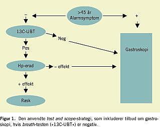 Med test and treat -strategien har man i kontrollerede undersøgelser vist at kunne reducere antallet af gastroskopier med 35-50% [6, 10, 11]. Vi har her opgjort erfaringerne med test and scope -strategien, som er forskellig fra test and treat -strategien. Resultaterne er derfor ikke umiddelbart sammenlignelige. I vores materiale havde lidt over halvdelen af patienterne - 340 af de 666 patienter - alarmsymptomer, hovedparten fordi de var over 45 år. De skulle derfor primært gastroskoperes. Hos 47 af de 326 patienter uden alarmsymptomer ordinerede den henvisende læge primær gastroskopi. De resterende 279 patienter blev primært breath -testet. Vi anbefalede i test and scope -strategien patienterne med negativt breath -test-resultat at få foretaget sekundær gastroskopi. Blandt de 230 patienter med negativt breath -test-resultat tog 197 mod tilbuddet, hvorved vi diagnosticerede øsofagitis hos 31 patienter og idiopatisk ulcus hos tre. Test and scope -strategien gav altså positivt fund og indikation for langtidsbehandling med syrehæmmende medicin hos 17% (95% sikkerhedsgrænser 12-22%) af patienterne med negativt breath -test-resultat. I test and treat -strategien, hvor man nøjes med breath -testen, ville diagnostik og behandling hos disse være blevet forsinket. Niogfyrre ud af 279 (18%, 95% sikkerhedsgrænser 14-22%) havde positivt breath -test-resultat. Dette svarer til tidligere danske erfaringer [1, 2, 6]. Andelen af patienter, der havde gevinst i form af positivt breath -test-resultat, var altså i vores materiale ikke forskellig fra andelen af patienter med negativt breath -test-resultat, hos hvem diagnostik og behandling ville være forsinket i test and treat -strategien. De patienter, der umiddelbart har størst gevinst af test and treat -strategien, er de Hp-positive. De får med breath -testen stillet en diagnose, nemlig Hp-korreleret dyspepsi, og får tilbudt specifik behandling. Gevinsten ved test and treat -strategien er derfor proportional med Helicobacter -prævalensen, som i mange lande ligger betydeligt højere end i Danmark [3, 14]. I lavprævalenslande har test and treat -strategien begrænset klinisk værdi.