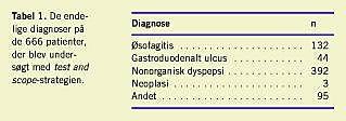 Materiale og metoder: I 2000 blev 666 patienter henvist til open access -dyspepsiudredning efter en test and scope -strategi på Medicinsk Afdeling, Herning Sygehus. Materialet blev opgjort pr. 1. januar 2002.