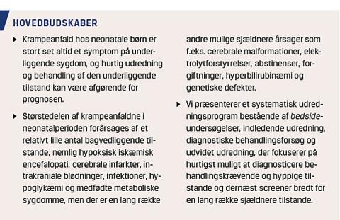 Krampeanfald i neonatalperioden er stort set altid symptom på en underliggende sygdom, og hurtig systematisk udredning kan være afgørende for prognosen. De fleste krampeanfald skyldes nogle få tilstande, men der er en lang række andre mulige årsager. I en ikkeubetydelig del af tilfældene kan der være flere mulige årsager samtidig. Undersøgelser indikerer klart, at systematisk udredning er mest effektiv.