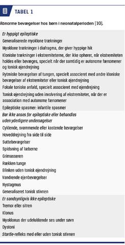 Krampeanfald i neonatalperioden kan være vanskelige at erkende klinisk [8, 9]. Som følge af et umodent centralnervesystem kan nyfødte desuden have sitren, spjæt og andre bevægelser, der kan mistolkes som krampeanfald [10]. En oversigt over abnorme bevægelser hos nyfødte vises i Tabel 1. Nyfødte kan desuden have elektriske krampeanfald helt uden kliniske tegn. Elektroence-