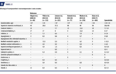 Krampeanfald i neonatalperioden kan skyldes en lang række forskellige tilstande. En sammenfatning af resultater fra studier, hvor årsagerne opgøres ses i Tabel 2.