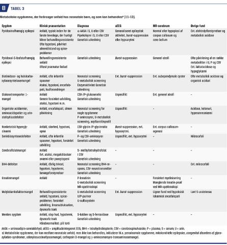 En række metaboliske sygdomme kan debutere med isolerede krampeanfald (Tabel 3). Disse sygdomme er ofte ikke forbundet med abnorme biokemiske fund, og specifikke test er nødvendige for at stille diagnosen [11]. Nogle få metaboliske sygdomme diagnosticeres hurtigst ved diagnostiske behandlingsforsøg.