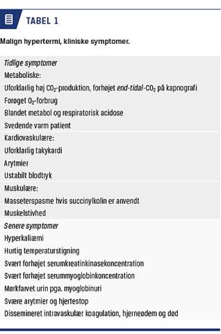 Der er ingen specifikke tegn på, at MH er under udvikling, og diagnostikken afhænger derfor helt af, at anæstesiologen er i stand til hurtigt at genkende et mønster i de kliniske symptomer (Tabel 1) [3]. Oftest er det en uforklarlig høj CO2-produktion eller en vedvarende takyarytmi, der fører til mistanken om MH, men rækkefølgen af symptomer og dermed præsentationen varierer meget.