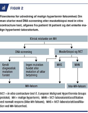 Hvor de tidligere guidelines for udredning af MH lagde op til, at man altid begyndte med at udrede et formodet tilfælde af MH med IVCT, åbner de nye guidelines for, at man kan begynde med at lave en genetisk screening først og se, om personen bærer en af de godkendte mutationer. I bekræftende fald kan diagnosen MH-følsom stilles uden brug af IVCT. Tilsvarende kan personer, som er familiemedlemmer i familier, hvor der er påvist en godkendt mutation, og bærer mutationen, få diagnosen MH-følsom uden IVCT. Derimod kan man fortsat ikke ved genetisk test alene frikende nogen for MH-følsomhed. Det kræver altid et normalt resultat ved IVCT at frikende en person for MH-følsomhed (Figur 2). Guidelines for genetisk udredning af MH-følsomhed indgår nu som en integreret del af de samlede guidelines fra EMHG for udredning af MH-følsomhed.