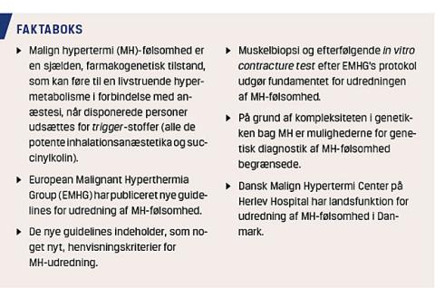 Der er netop publiceret nye internationale guidelines [1] for udredning af MH-følsomhed samtidig med, at over 2.000 danskere nu er blevet undersøgt for deres MH-følsomhed. I denne artikel gennemgås kort tilstanden og udredningen.