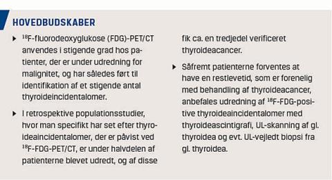 Til trods for en mulig overestimering af malignitetsrisikoen er patienter med 18F-FDG-positive thyroideaincidentalomer i øget risiko for at få thyroideacancer. Klinikeren står over for nye diagnostiske udfordringer. Hvorvidt udredningen af 18F-FDG-positive thyroideaincidentalomer har en betydningsfuld effekt på patienternes prognose og livskvalitet, kan ikke afgøres ud fra den foreliggende litteratur.