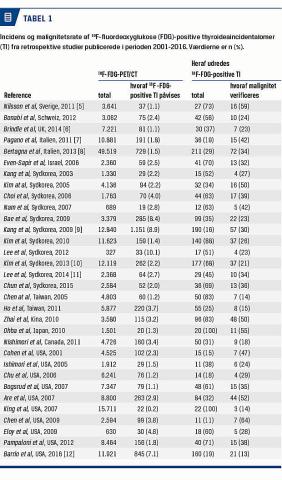 I perioden 2001-2016 er der publiceret en række retrospektive studier om udredningen af thyroideaincidentalomer, der er fundet ved 18F-FDG-PET/CT (Tabel 1). Den angivne forekomst af thyroideaincidentalomer er varierende (0,2-10,1%) og i gennemsnit 3,0%. Sammenligning af disse studier er vanskeliggjort af betydelige forskelle i afgørende variable som inklusions- og eksklusionskriterier, populationsstørrelser samt etnicitet og dermed forskelle i prævalensen af thyroideacancer betinget af geografisk og genetisk variation. Litteraturen indbefatter ikke en dansk population, og der findes få studier med patienter, der har samme jodstatus, som befolkningen i Danmark har. Fra Europa findes et svensk studie af Nilsson et al [5], hvor forekomsten af thyroideaincidentalomer er opgjort til 1,1% i