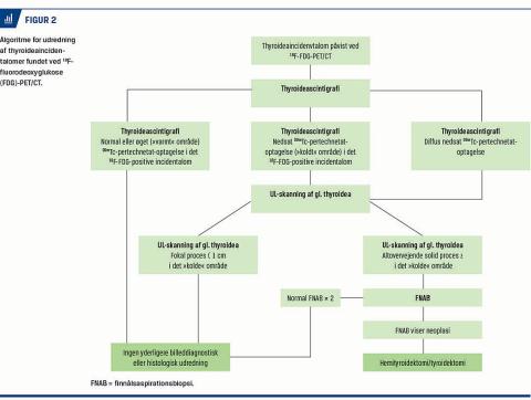 I Dansk Endokrinologisk Selskab (www.endocrinology.dk) anbefales det ligeledes at udrede thyroideaincidentalomer, der er fundet ved 18F-FDG-PET/CT. Figur 2 illustrerer en algoritme for udredningen, som uddybes i det følgende.