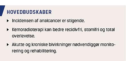 The incidence of anal cancer is increasing. The primary treatment consists of radiotherapy concomitant with chemotherapy. Short- and long-term side effects are common, and supportive care during treatment and rehabilitation after treatment is necessary. Locoregional recurrence is treated with an abdominoperineal resection with sigmoideostomia and/or lymph node exairesis. Staging and treatment is done centralized. The prognosis has improved over the latest 10-20 years with a long-term overall survival of > 70% after primary therapy and approximately 50% after surgical treatment for recurrence.