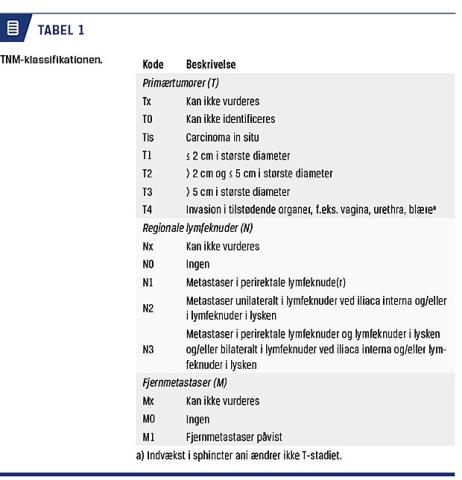 patienter uanset sygdomsstadie henvises til et af centrene, også ved begrundet mistanke om analcancer. Iht. nationale retningslinjer [10] udføres der transrektal UL-skanning og gynækologisk undersøgelse i universel anæstesi. Tumorstørrelse, -beliggenhed og TNM-stadie noteres (Tabel 1) [11]. Suspekte fund biopteres. Endvidere foretages der CT eller PET-CT samt MR-skanning.