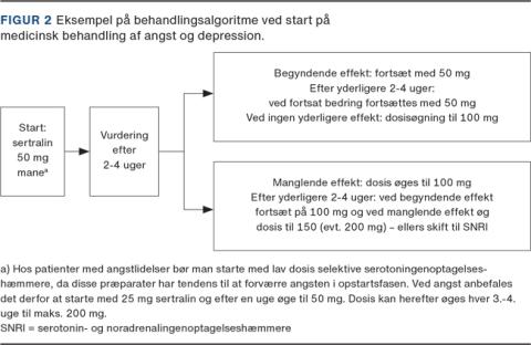 Førstevalg ved såvel depression som angstlidelse er selektive serotoningenoptagelseshæmmere (SSRI). Det anbefales at starte med sertralin, citalopram eller escitalopram pga. den klinisk relevante lavere bivirknings- og interaktionsrisiko. Det anbefales at vurdere effekt og bivirkninger løbende. Hvis der alene er tale om angstsymptomer, bør man starte lavt i dosering og gå langsomt frem. Ved utilstrækkelig effekt anbefales dosisøgning hver 2.-4. uge til maksimumdosis [17, 18]. Ved påbegyndelse af behandling med SSRI er det vigtigt at informere patienten om bivirkninger, hvoraf de fleste er forbigående. Det er særligt vigtigt at informere patienten om, at angstsymptomer kan forværres ved påbegyndelse af behandlingen.